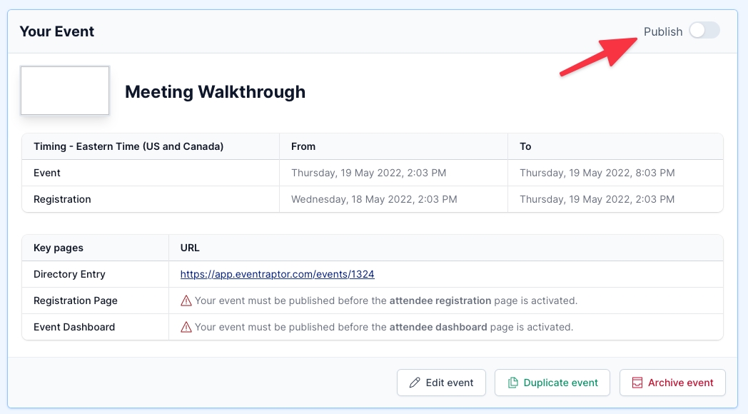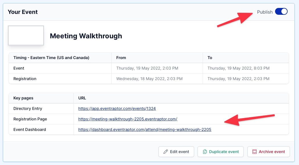 Once you’ve got your Event set up, the final step is to hit Publish, shown by the red arrow in the image above.