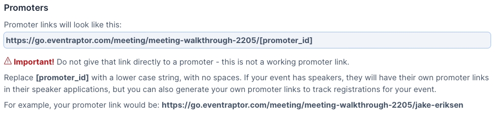 You can swap [promoter_id] for things like “facebook” or “linkedin” when you share links on social media or promote the Event through ads, to track performance of how many people signed up from that source.