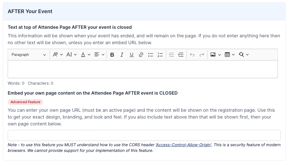 Here you can enter any text that you want to be shown after the Event. The page will automatically update to this content at the exact date and time you have set as the end of your Event, or calculated as the start time plus the Event duration.