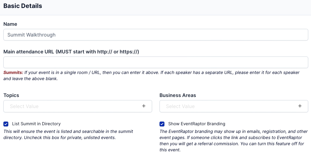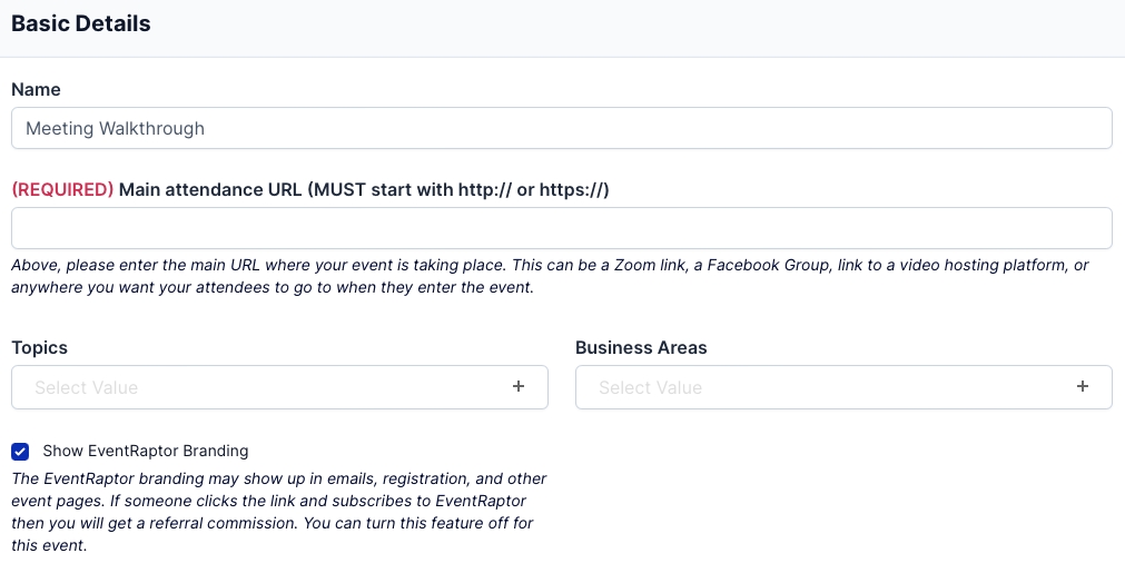 Topics & Business Areas: Here you can enter some metadata about your Event. This helps people find you and your Event during searches on the EventRaptor platform.