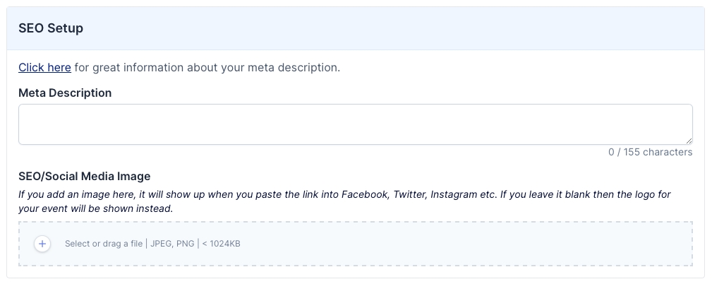 In this section you can add an SEO Meta Description, as well as an SEO image that appears in social media previews for your Event link.