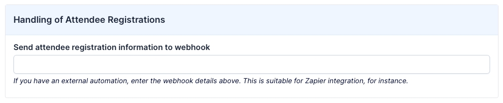 In this section, you can add Webhook details if you’re using a platform like Zapier to take registration information from EventRaptor and add it to another system.