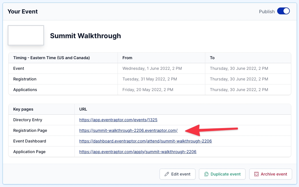 Head to your Dashboard. Once you've Published your Event for the first time, you'll have several links on the Dashboard page, including the link to your Registration Page.