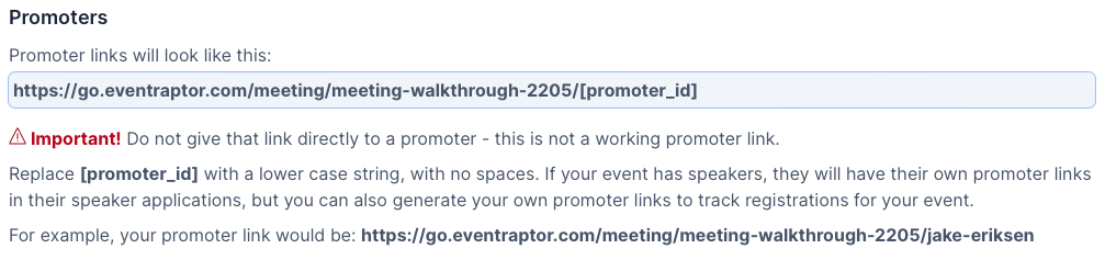 * You can swap \[promoter\_id] for things like “facebook” or “linkedin” when you share links on social media or promote the Event through ads, to track performance of how many people signed up from that source.