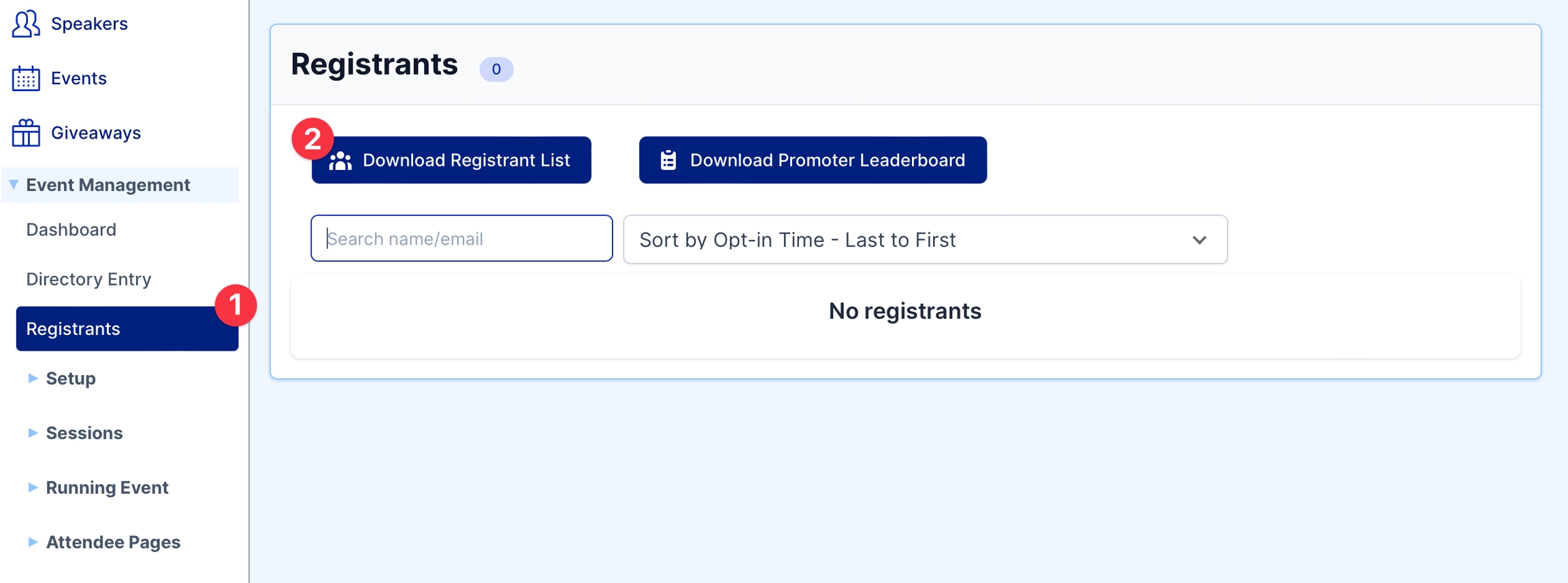 Click on "Registrants" under the "Event Management" submenu - from there, you can download a CSV file with information from each of the Registrants by clicking on the "Download Registrant List" button. You can use a program like Microsoft Excel, Apple Numbers, or upload the file to Google Sheets to view it, or import it into your mailing list or automation systems.