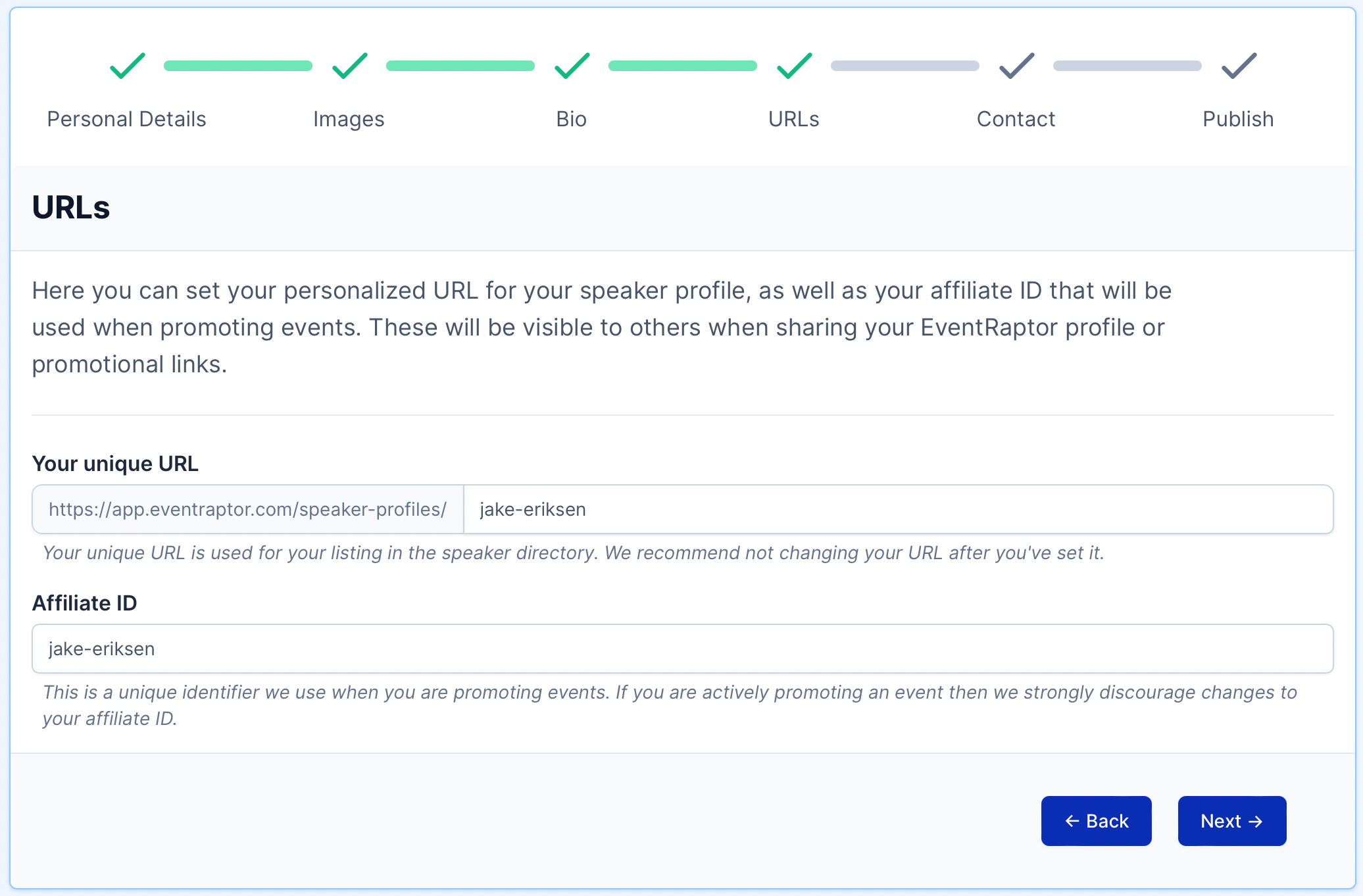 Your Unique URL is the link to your EventRaptor Speaker Profile, so that you can share it with prospective Hosts and other people that you want to view your profile. Your URL will take the form of https://app.eventraptor.com/speaker-profiles/[YOUR_UNIQUE_URL]. You can enter anything you want here, as long as it's not been taken by someone else.