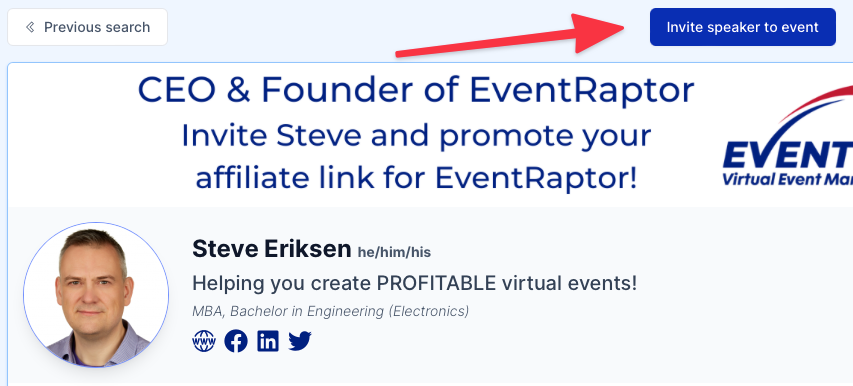 • Option 2: Invite speakers from the Speaker Directory. Click "Speakers" in the sidebar, and find a speaker that looks like a good fit for your Summit. Click on their profile, and then the button that says "Invite speaker to event" at the top of the page. This will then open a slide-out menu where you can choose what Summit you want the speaker to apply for. They'll receive an email from us letting them know they have been invited to apply to speak at the Summit.