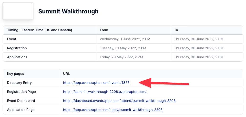• Option 1: Send a link to your Summit page in EventRaptor, so the prospective speaker can learn more about your event. You can find this by going to your Dashboard and finding the Directory Entry link. They will then see a blue button on the top and bottom of the page that says "Apply to be a speaker"