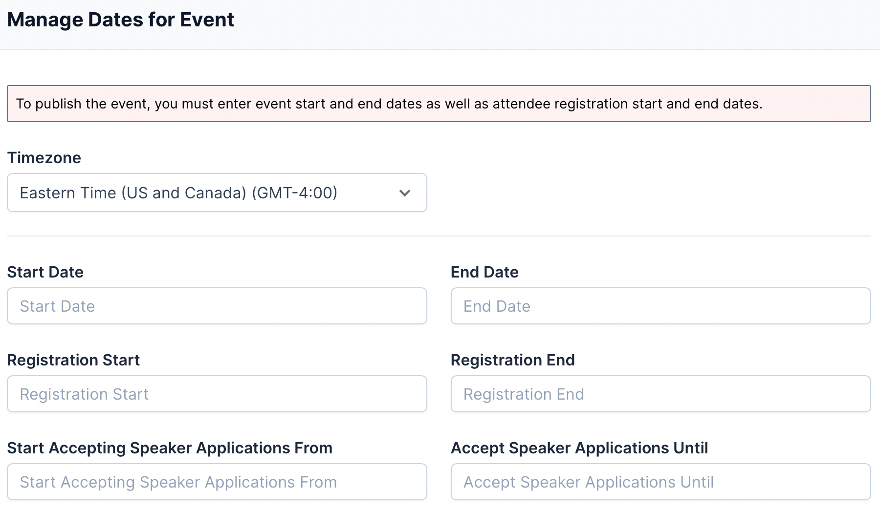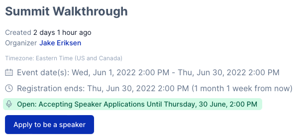 Make sure you set dates and times for "Start Accepting Speaker Applications From" and "Accept Speaker Applications Until" - this is the period of time that speakers will have access to the ability to apply to your Summit.